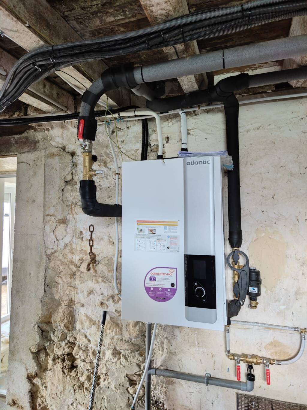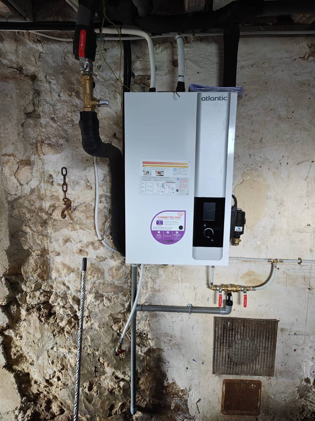 Nous avons remplacé une chaudière fioul autre qu'à condensation par une pompe à chaleur air/eau moyenne température de marque Atlantic modèle ALFEA EXCELLIA S 12 TRI en triphasé, pour le chauffage seul.